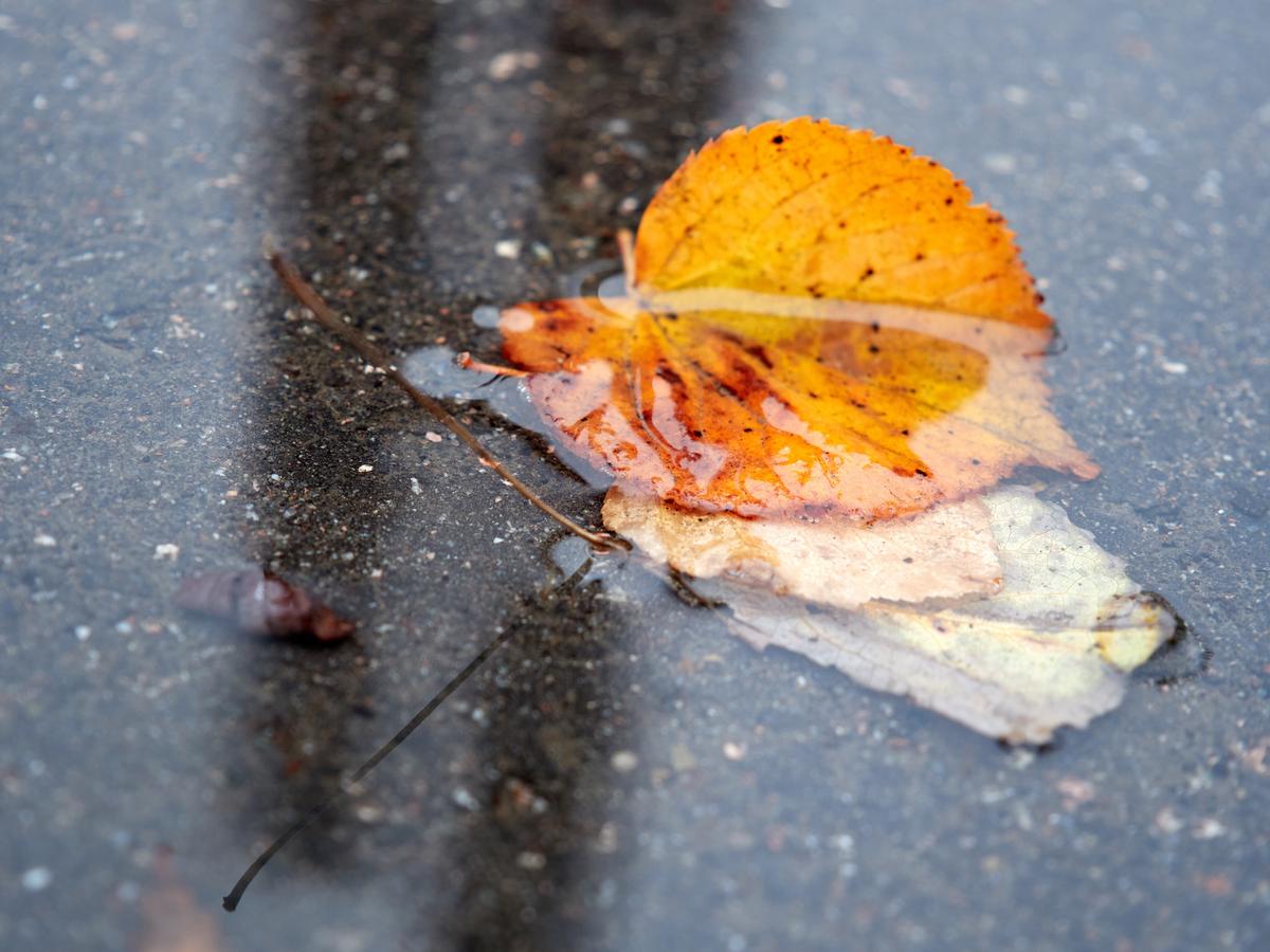 Photo: A yellow leaf lying in a puddle on asphalt.